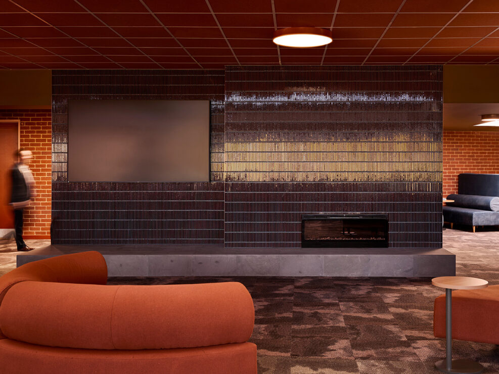 At the space’s heart, a fireplace clad in biscuit-brown tiles evokes an heirloom feel, while a sharp, jazzy blue grout ensures the heritage feels fresh, not frozen. By honoring robust historical bones through a contemporary lens, the library becomes a vibrant, forward-looking hub for learning.