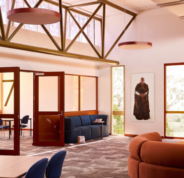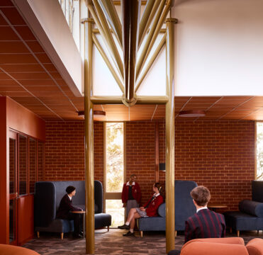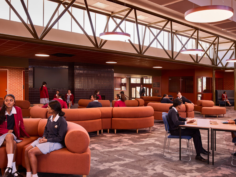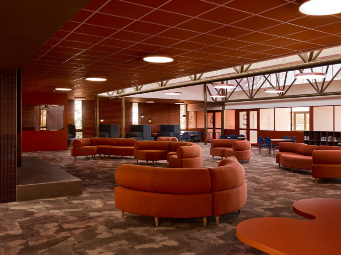 The design celebrates the building’s industrial skeleton, highlighting exposed steel trusses in high-gloss green while drawing the “outside in” by echoing the site’s heritage fretwork and terracotta rooflines. Eschewing literal branding, the palette uses plush blue and terracotta seating to provide a nuanced complement to the school’s uniforms. This earthy base is punctuated by playful interventions, such as light pink door frames against heavy original brickwork.